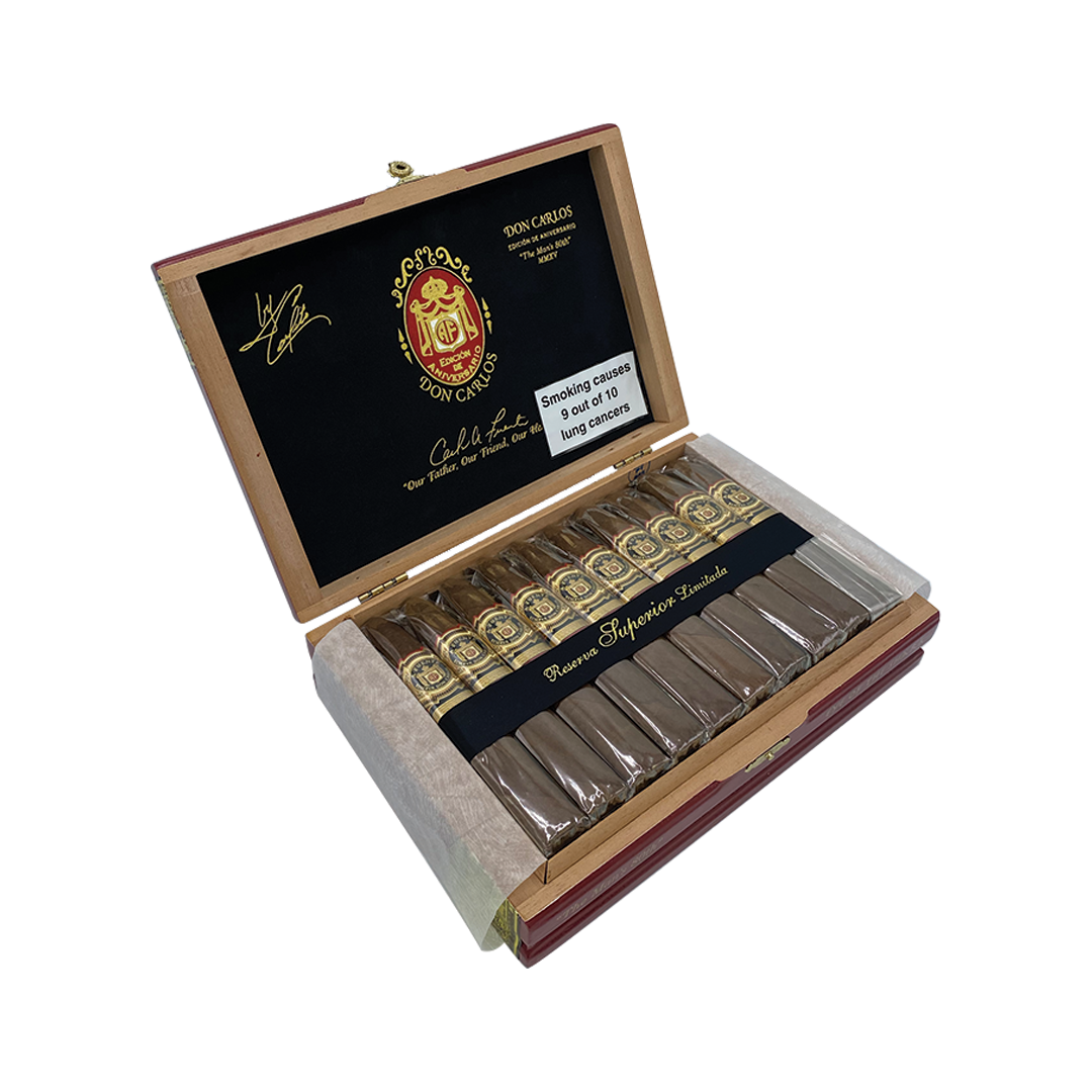 Upon lighting, smokers are greeted with notes of cedar, toasted almonds and warm baking spices, evolving gracefully into hints of cocoa, leather and subtle sweetness. The tapered head concentrates flavors while ensuring a smooth, balanced draw throughout the smoke. Medium to full in body, the Don Carlos The Man’s 80th offers sophistication without overpowering the palate.